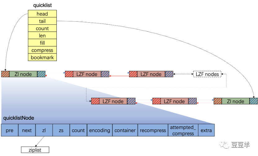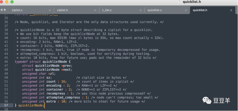 quicklistNode就是双链表的节点封装了,除了前后节点的指针外,这里还包含一些本节点的其他信息。比如是否是LZF压缩的节点等等,看一下源码中的声明。