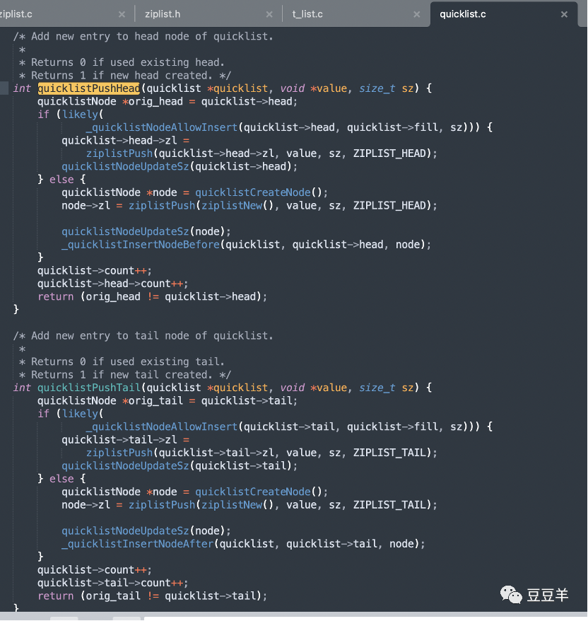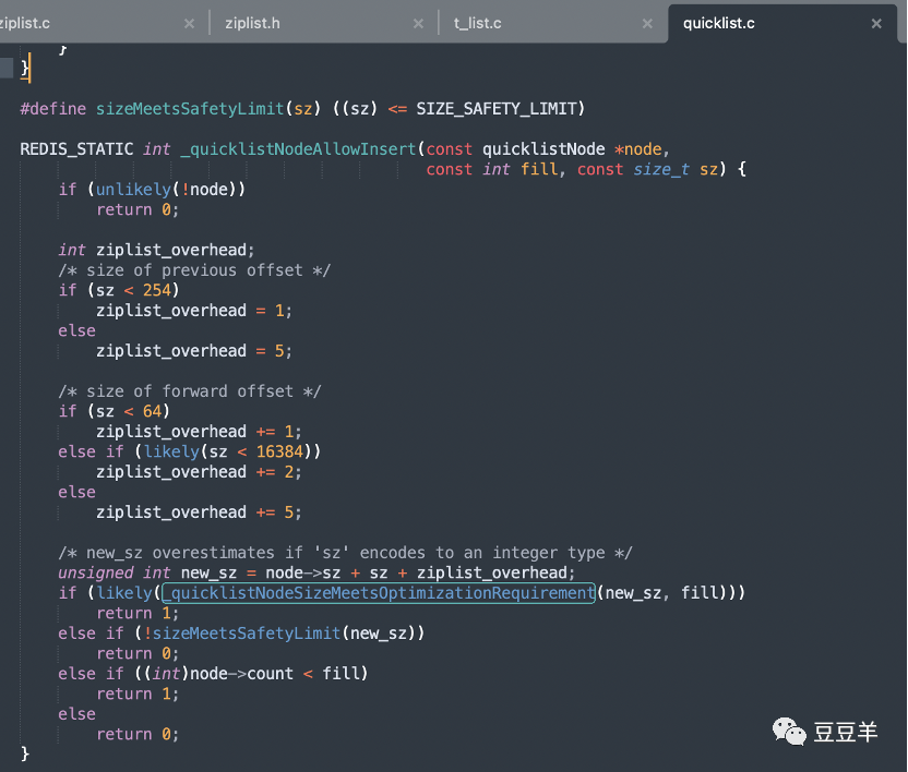 头插和尾插都调用了_quicklistNodeAllowInsert先判断了是否能直接在当前头|尾节点能插入,如果能就直接插入到对应的ziplist里,否则就需要新建一个新节点再操作了。还记得上文中我们说的fill字段吗,_quicklistNodeAllowInsert其实就是根据fill的具体值来判断是否已经超过最大容量。这一段的具体逻辑解释在前面有深入讲过,这里就不赘述了。