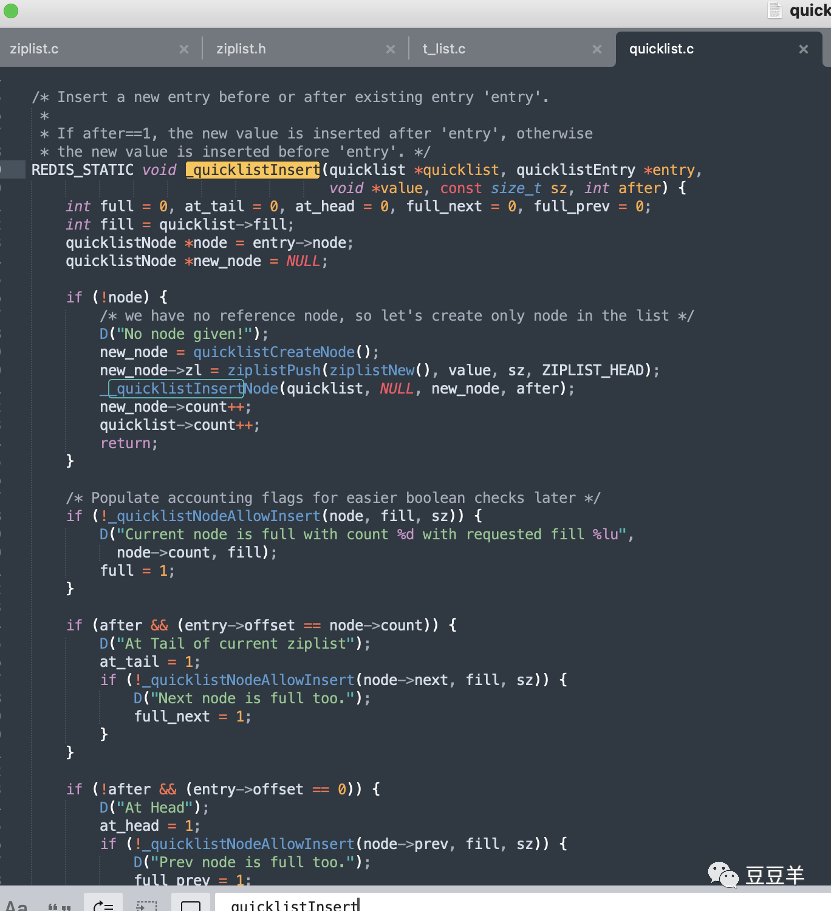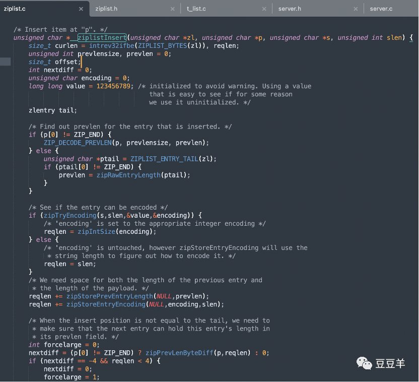 压缩列表插入元素,源码如下,由于太多,就先截取一部分。参数zl表示压缩列表首地址,p指向新元素的插入位置,s表示数据内容,slen表示数据长度,返回参数为压缩列表首地址。