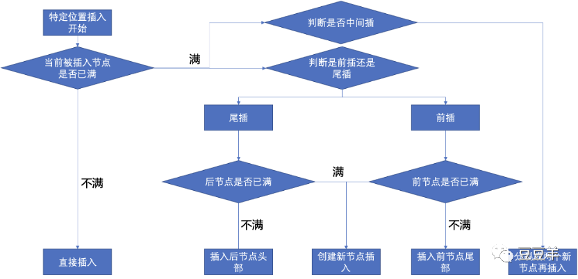 2、如果当前被插入节点是满的,要插入的位置是当前节点的尾部,且后一个节点有空间,那就插到后一个节点的头部。