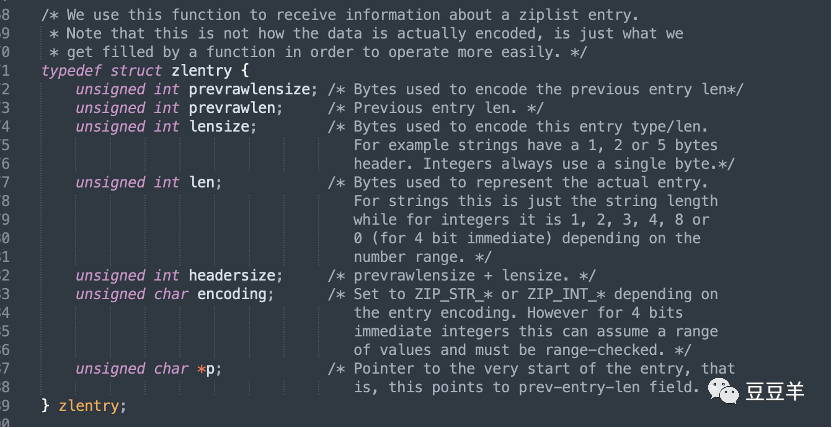 unsigned int prevrawlensize; /* previous_entry_length字段的长度*/ unsigned int prevrawlen; * previous_entry_length字段存储的内容*/ unsigned int lensize; /* encoding字段的长度*/ unsigned int len; /*数据内容长度*/ unsigned int headersize; /*当前元素的首部长度,即previous_entry_length字段长度与encoding字段长度之和*/ unsigned char encoding; /*数据类型*/ unsigned char *p; /*数据内容指针*/ |