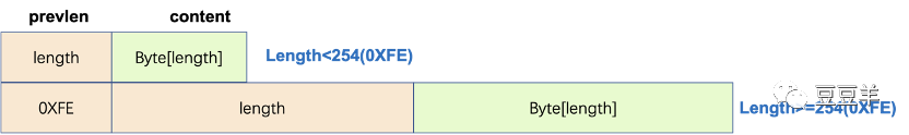 previous_entry_length:表示前一个元素的字节长度,占1个或者5个字节。当前一个元素的长度小于254(0X FE)时,使用一个字节表示,如果达到或超出254(0X FE)时,那就用5个字节表示,其中第一个字节是0X FE,剩余四个字节表示字符串长度。