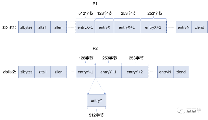 压缩列表ziplist1,元素entry X之后的所有元素entry X+1,entry X+2等长度都是253字节,显然这些元素的previous_entry_length字段的长度都是1字节。当删除元素entry X时,元素entry X+1的前驱节点改为元素entry X-1,长度为512字节,此时元素entry X+1的previous_entry_length字段需要5字节才能存储元素entry X-1的长度,则元素entry X+1的长度需要扩展至257字节;而元素entry X+1长度的增加,元素entry X+2的previous_entry_length字段同样需要改变。以此类推,由于删除了元素entry X,之后的所有元素entry X+1,entry X+2等长度都必须扩展,而每次元素的扩展都将导致重新分配内存,效率是很低下的。压缩列表ziplist2,插入元素entry Y同样会产生上面的问题。