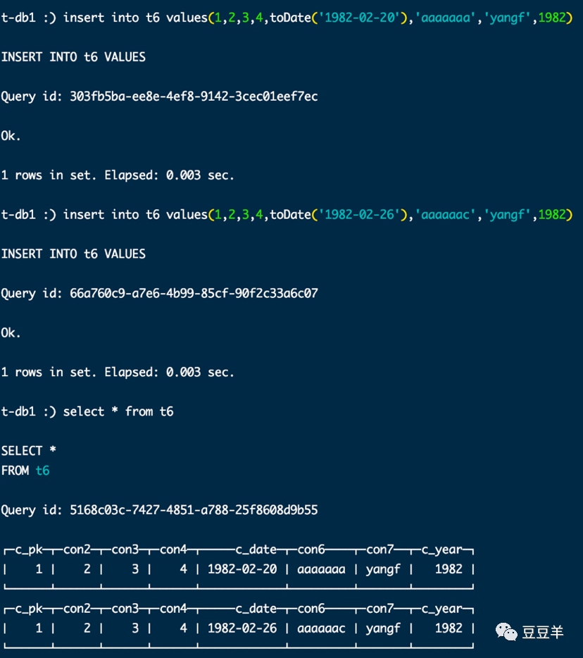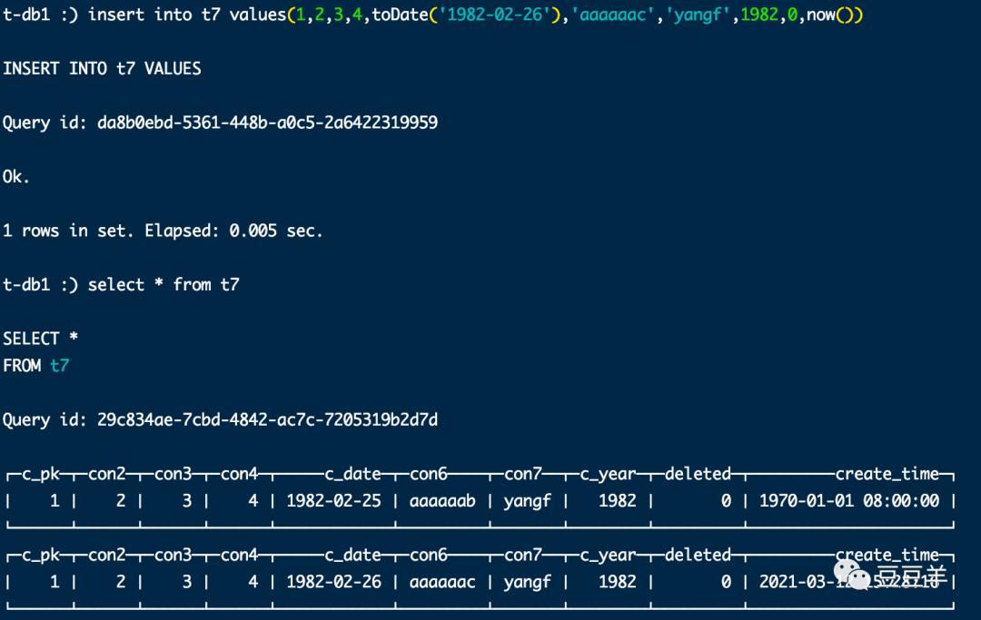 insert into t7(c_pk,con2,con3,con4,c_date,con6,con7,c_year) values(1,2,3,4,toDate('1982-02-25'),'aaaaaab','yangf',1982)