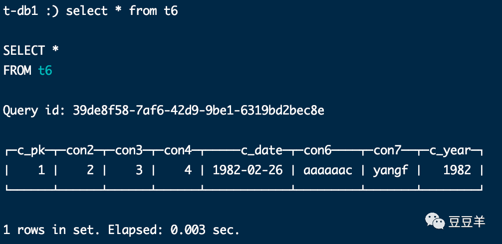 insert into t7 values(1,2,3,4,toDate('1982-02-26'),'aaaaaac','yangf',1982,0,now())
