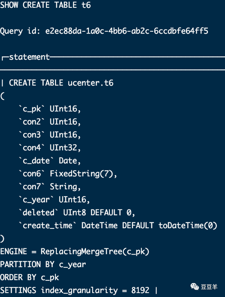 我设定使用的引擎是合并树家族的替代合并树。之所以使用这个引擎,主要就是为了数据的去重。我定义了一个年字段作为它的分区字段,使用一个特定字段c_pk作为排序字段。在 click house中在不指定primary key的情况下,默认会将排序字段作为表的主键。