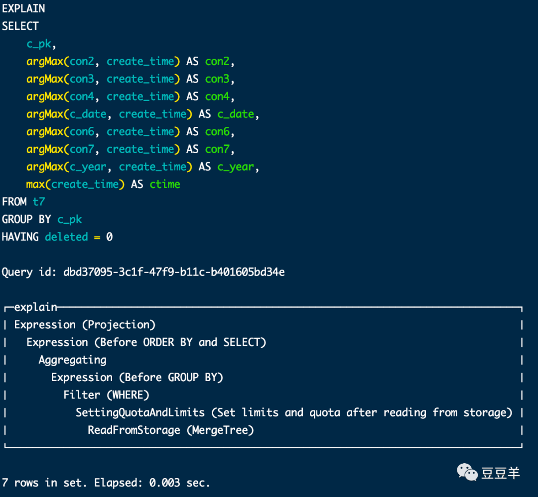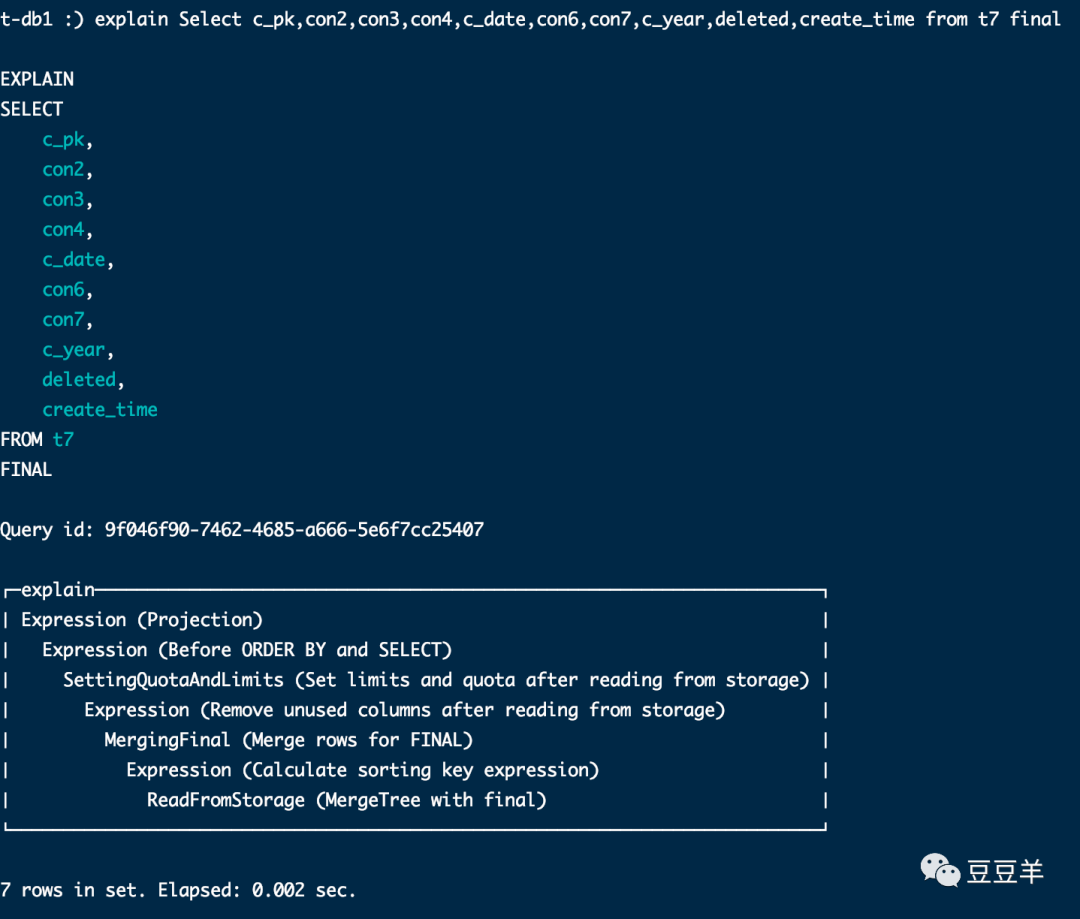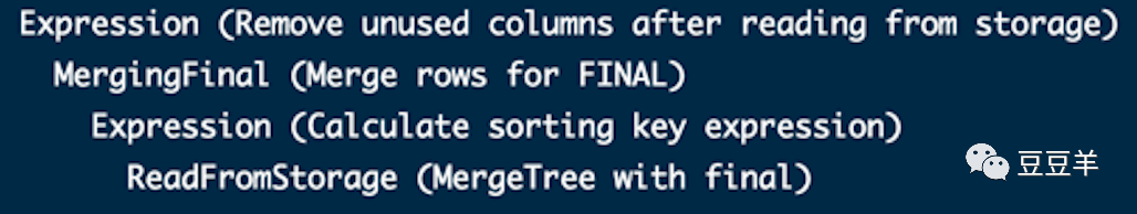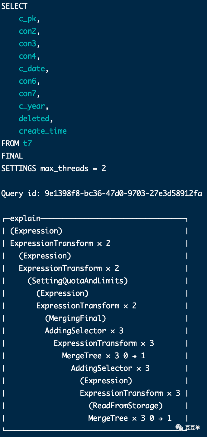 第三种方式,可以从SQL语法上进行合并,如应用final修饰符,这样在查询的过程中将会执行Merge的特殊逻辑,比如数据去重,预聚合等等。但这个方法会将查询变成一个单线程的执行过程,与我们预期使用clickhouse的本质相背离,原本就是想利用单次查询走多线程来提升性能。这种方式反而和原生的mysql等关系型数据库的单次查询处理方式一致,有些本末倒置了。