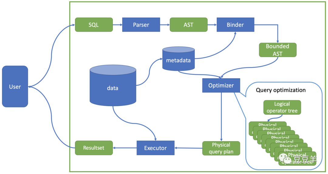 当用户输入SQL语句后,第一步是通过编译器( Parser)把语句编译成抽象语法树(Abstracted Syntax Tree)。这一步的主要过程就是确保输入语句没有SQL语法和词法错误。然后再通过绑定器(Binder)将语法树和数据库的元数据(metadata)结合,为它附上语义(semantic)。比如咱们这个语句里有select c_pk,argMax(con2…from t7,绑定器会去查询元数据确认t7表是否存在;如果存在,是否有c_pk,con2等属性存在,对于属性的后续操作是否符合规则,例如这里的argMax等。检查过程是自底向上对整棵语法树的节点依次进行,检查的同时也把相关表的元数据,属性的元数据附在语法树上,最后生成含有语义的语法树(Bound AST)。下一步就是走优化器了,优化器(Optimizer)会根据给定的语法树生成一个逻辑执行树(logical operator tree)
