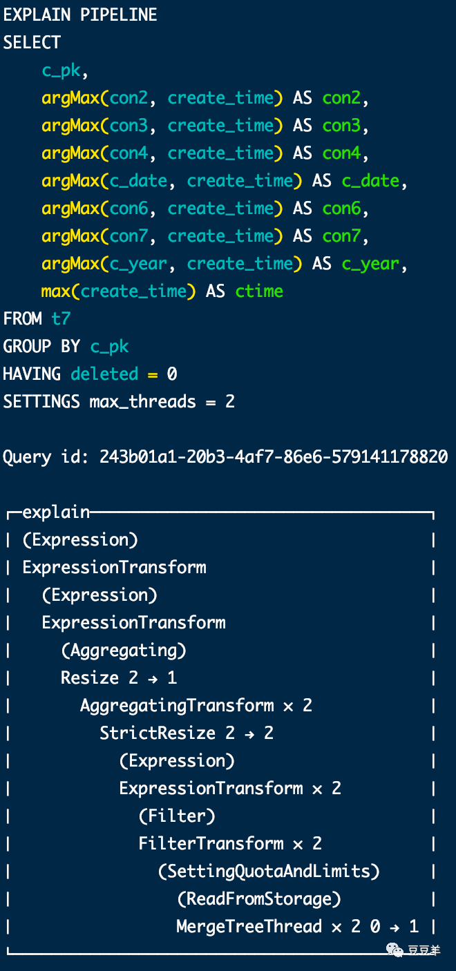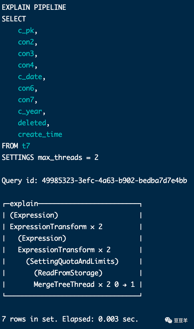 虽然结果是相同的,但是计算过程明显不一样。为了体现差异,我再插入一行数据,同时设定两个线程,使用explain pipeline看一下执行结果