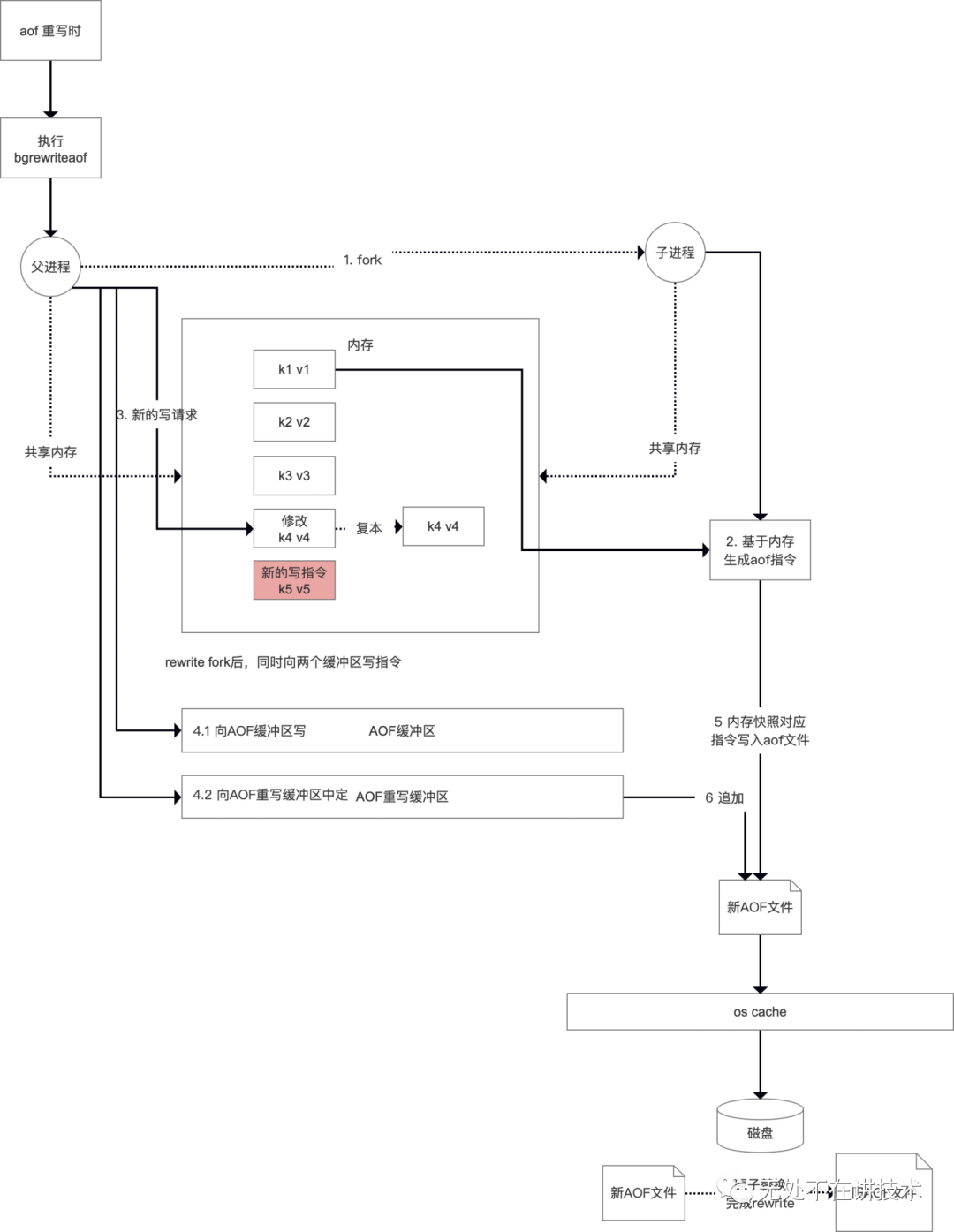 文件过大时,触发rewrite,处理成可恢复时当前指定最小集合,并原子替换, rewrite时不是基于旧的指定进行合并,而是基于当前内存数据进行merge,健壮性提高