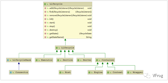 由于所有的组件均存在初始化、启动、停止等生命周期方法,拥有生命周期管理的特性, 所以Tomcat在设计的时候, 基于生命周期管理抽象成了一个接口 Lifecycle ,而组件 Server、Service、Container、Executor、Connector组件 , 都实现了一个生命周期的接口,从而具有了以下生命周期中的核心方法: