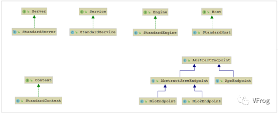 上面我们提到的Server、Service、Engine、Host、Context都是接口,下图中罗列了这些接口的默认实现类。当前对于 Endpoint组件来说,在Tomcat中没有对应的Endpoint接口, 但是有一个抽象类 AbstractEndpoint ,其下有三个实现类:NioEndpoint、Nio2Endpoint、AprEndpoint, 这三个实现类,分别对应于前面讲解链接器 Coyote时, 提到的链接器支持的三种IO模型:NIO,NIO2,APR , Tomcat8.5版本中,默认采用的是 NioEndpoint。