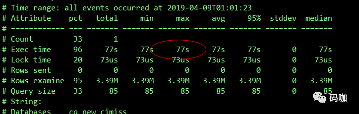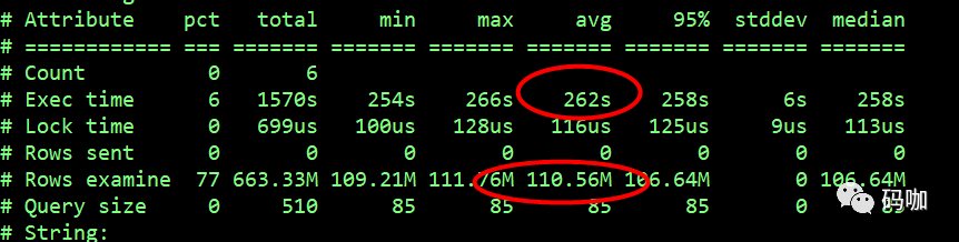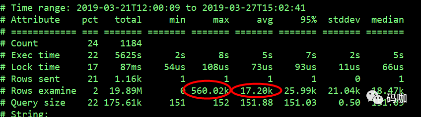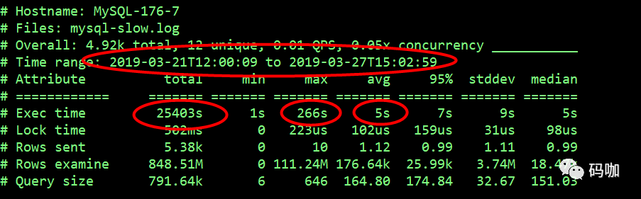 最近一个星期内,总共记录的慢查询执行花费时间为25403s,最大的慢sql执行时间为266s,平均每个慢sql执行时间5s,平均扫描的行数为1766万