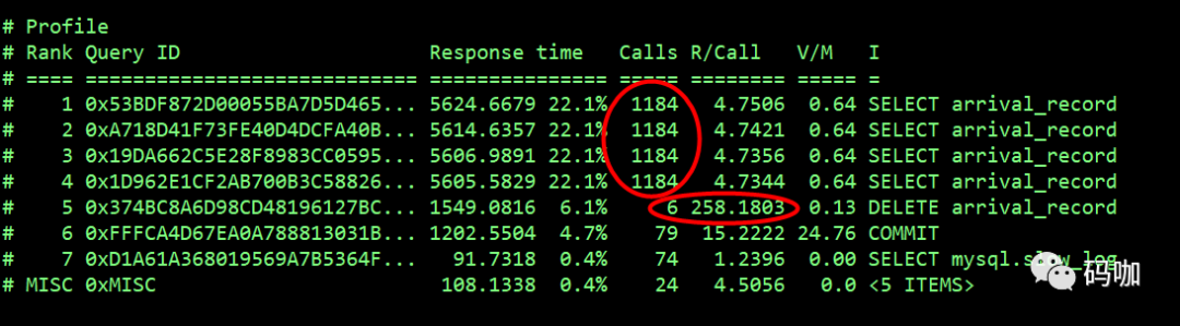 select arrivalrecord操作记录的慢查询数量最多有4万多次,平均响应时间为4s,delete arrivalrecord记录了6次,平均响应时间258s