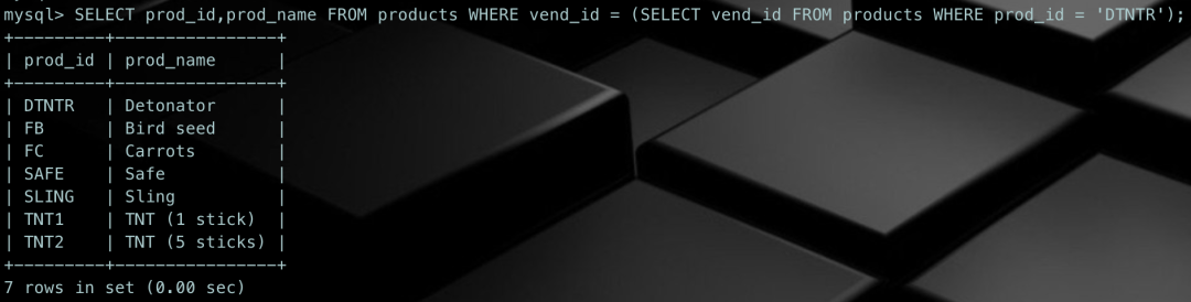 SELECT prod_id,prod_name FROM products WHERE vend_id = (SELECT vend_id FROM products WHERE prod_id = 'DTNTR');