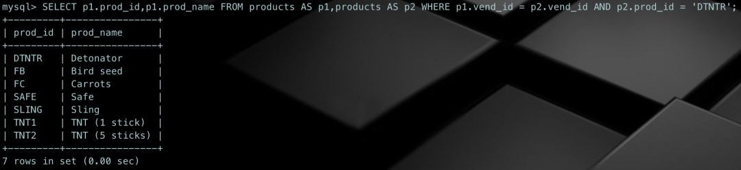 SELECT p1.prod_id,p1.prod_name FROM products AS p1,products AS p2 WHERE p1.vend_id = p2.vend_id AND p2.prod_id = 'DTNTR';