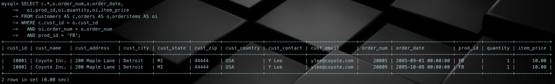 SELECT c.*,o.order_num,o.order_date, oi.prod_id,oi.quantity,oi.item_priceFROM customers AS c,orders AS o,orderitems AS oiWHERE c.cust_id = o.cust_id AND oi.order_num = o.order_num AND prod_id = 'FB';
