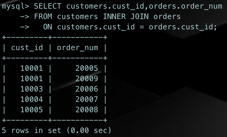 SELECT customers.cust_id,orders.order_numFROM customers INNER JOIN orders ON customers.cust_id = orders.cust_id;