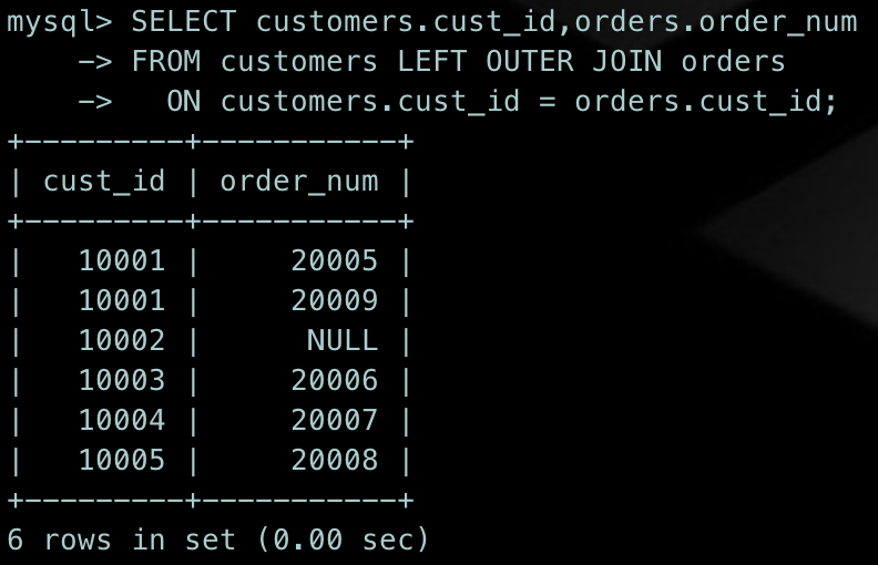SELECT customers.cust_id,orders.order_numFROM customers LEFT OUTER JOIN orders ON customers.cust_id = orders.cust_id;