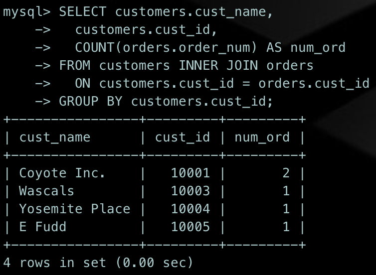 SELECT customers.cust_name, customers.cust_id, COUNT(orders.order_num) AS num_ordFROM customers INNER JOIN orders ON customers.cust_id = orders.cust_idGROUP BY customers.cust_id;