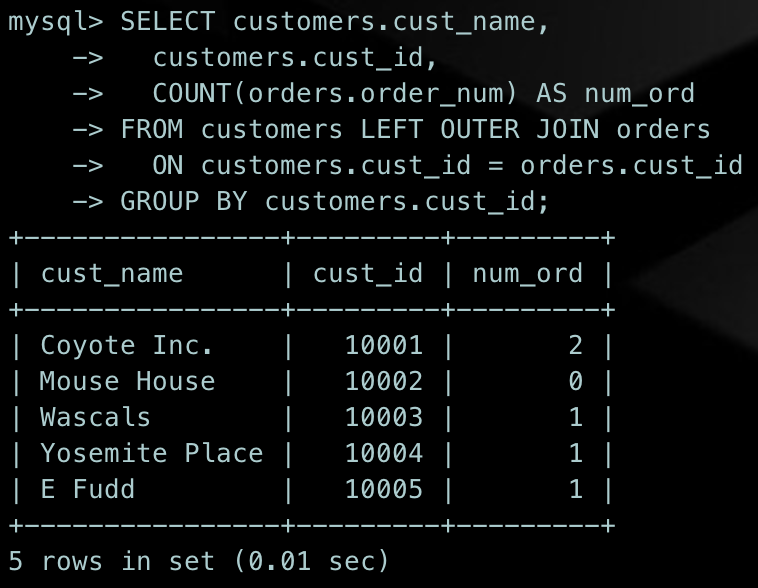 SELECT customers.cust_name, customers.cust_id, COUNT(orders.order_num) AS num_ordFROM customers LEFT OUTER JOIN orders ON customers.cust_id = orders.cust_idGROUP BY customers.cust_id;