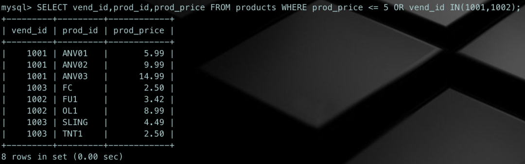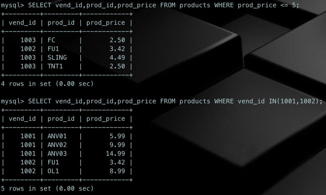 SELECT vend_id,prod_id,prod_price FROM products WHERE prod_price <= 5;SELECT vend_id,prod_id,prod_price FROM products WHERE vend_id IN(1001,1002);