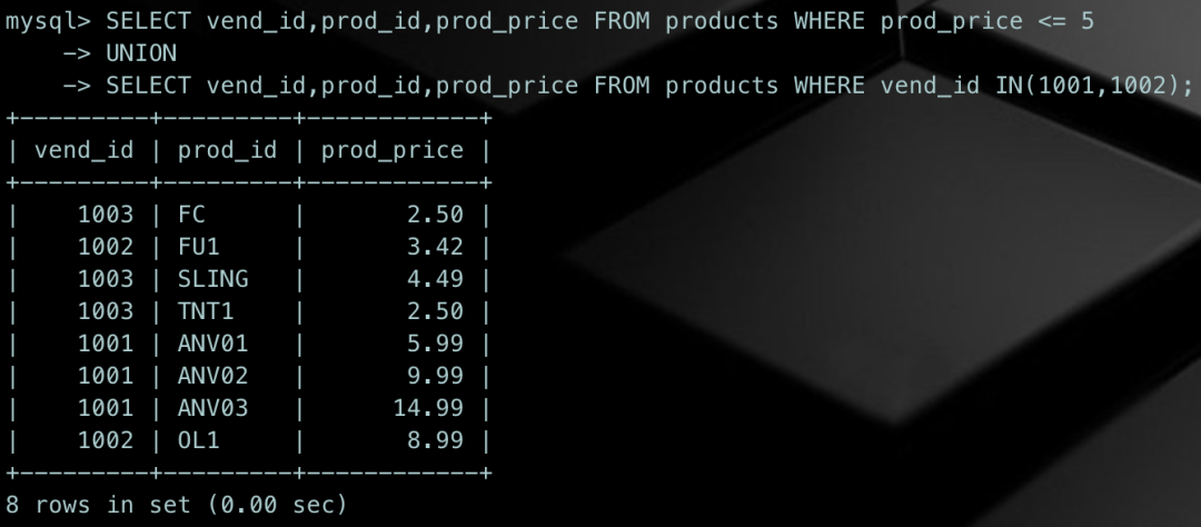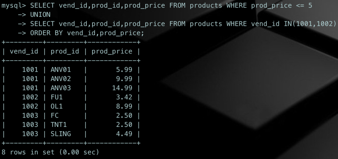 SELECT vend_id,prod_id,prod_price FROM products WHERE prod_price <= 5UNIONSELECT vend_id,prod_id,prod_price FROM products WHERE vend_id IN(1001,1002)ORDER BY vend_id,prod_price;