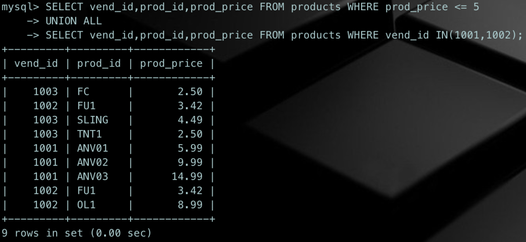 SELECT vend_id,prod_id,prod_price FROM products WHERE prod_price <= 5UNION ALLSELECT vend_id,prod_id,prod_price FROM products WHERE vend_id IN(1001,1002);