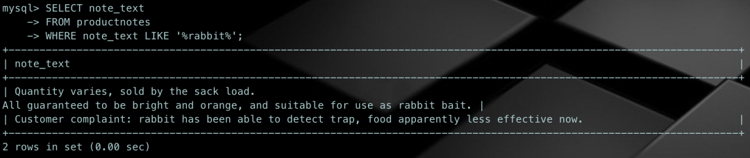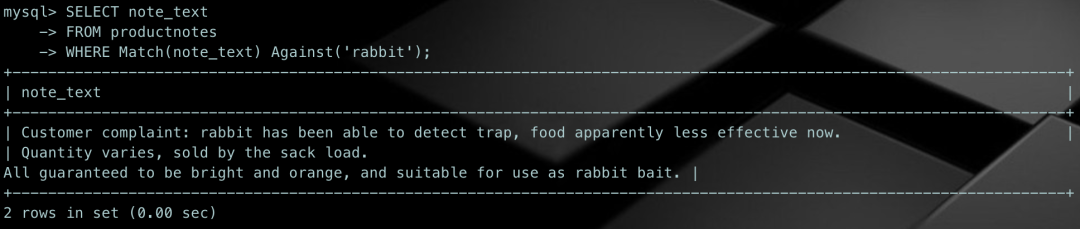SELECT note_textFROM productnotesWHERE Match(note_text) Against('rabbit');