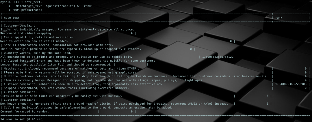 SELECT note_text, Match(note_text) Against('rabbit') AS 'rank'FROM productnotes;