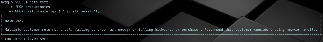 SELECT note_textFROM productnotesWHERE Match(note_text) Against('anvils');