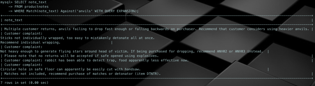 SELECT note_textFROM productnotesWHERE Match(note_text) Against('anvils' WITH QUERY EXPANSION);