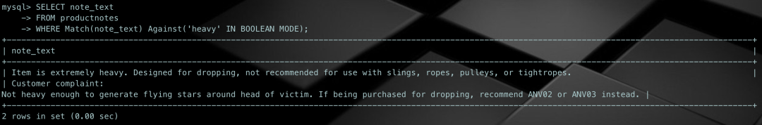 SELECT note_textFROM productnotesWHERE Match(note_text) Against('heavy' IN BOOLEAN MODE);