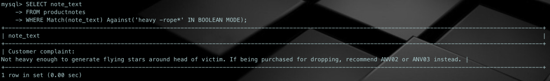 这次只返回一行。这一次仍然匹配词heavy,但-rope*明确地指示MySQL排除包含rope*(任何以rope开始的词,包括ropes)的行,这就是为什么上一个例子中的第一行被排除的原因。