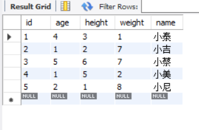 INSERT INTO user(id,age,height,weight,name)VALUES(4,1,5,2,'小美');