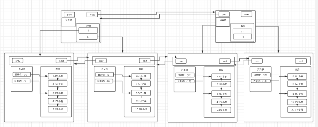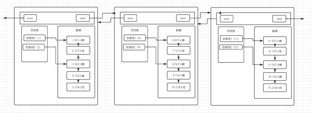 可以看到,在数据不断变多的情况下,MySQL会再去开辟新的页来存放新的数据,而每个页都有指向下一页的指针和指向上一页的指针,将所有页组织起来(这里修改了一下数据,将每一列的数据都放到了数据区中,其中第一个空格之前的代表id),第一页中存放id为1-5的数据,第二页存放id为6-10的数据,第三页存放id为11-15的数据