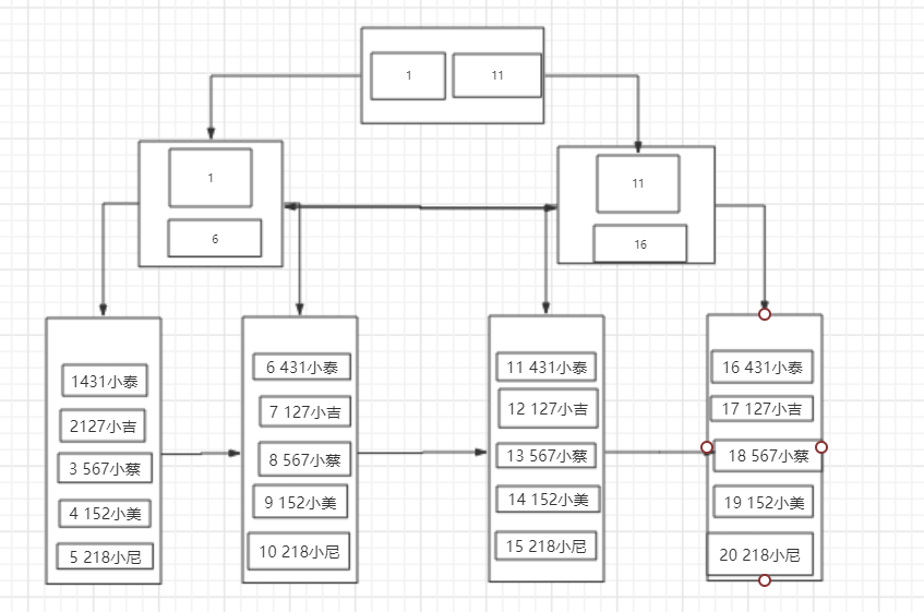 这就是我们兜兜转转由简到繁形成的一颗B+树。和常规B+树有些许不同,这是一棵MySQL意义上的B+树,MySQL的一种索引结构,其中的每个节点就可以理解为是一个页,而叶子节点也就是数据页,除了叶子节点以外的节点就是目录页。