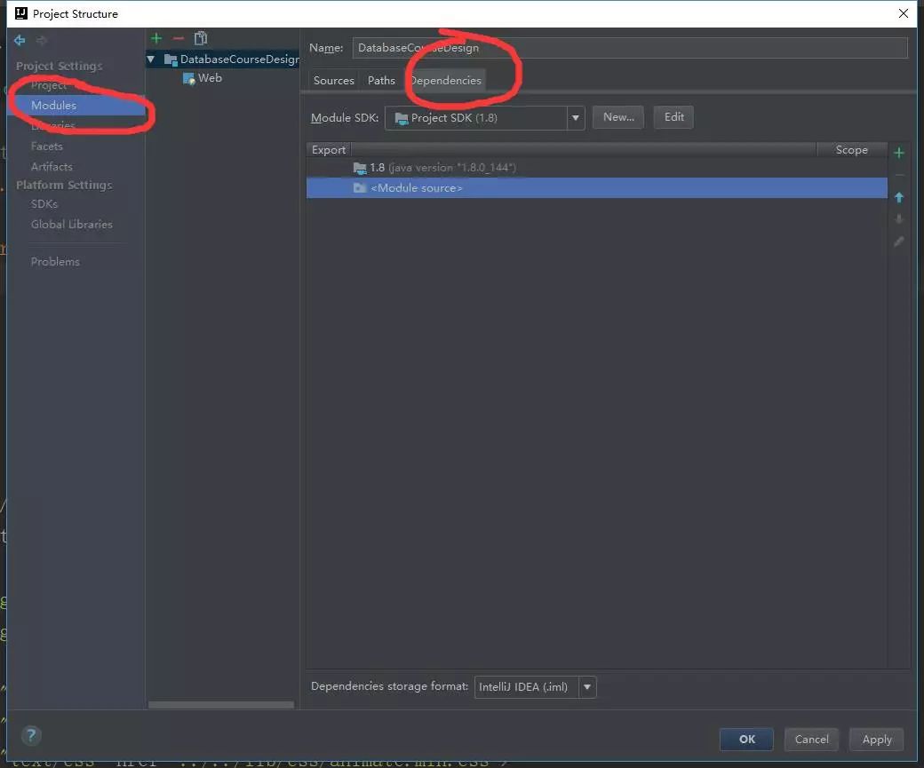 4、点击左边的modules,然后再右边找到dependencies,如图