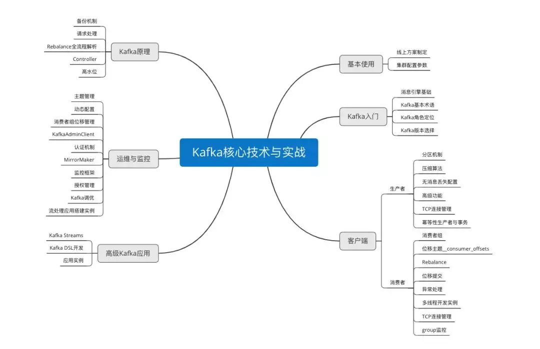 第一张图来自专栏《Kafka 核心技术与实战》,总结了一条高效的 Kafka 实战学习路径,把 Kafka 集群环境的监控和管理、内容原理剖析,以及消息系统常见疑难问题,都讲得清晰透彻。我最大的收获,就是对 Kafka 的原理、机制以及参数的理解更深入了。