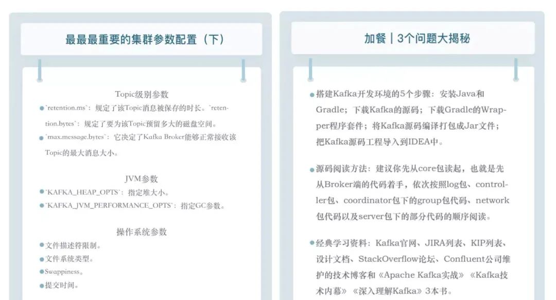 第一季「Kafka 实战」中,我自己印象最深刻的,是胡夕讲参数配置的时候,在文章里分享了最重要、最核心的集群参数配置。看完这两讲之后,对于一直以来持有的“Kafka 配置优化过程中怎么有这么多参数”的怨念,才得以消解。