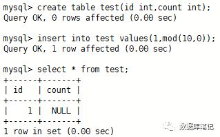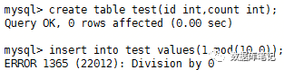 样例SQL:insert into test1 values(mod(10,0),’qwer’);