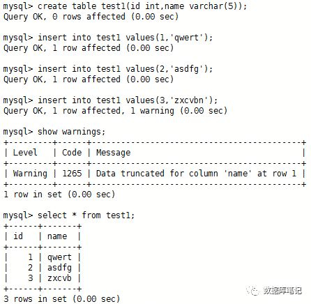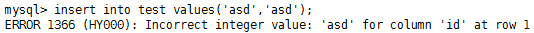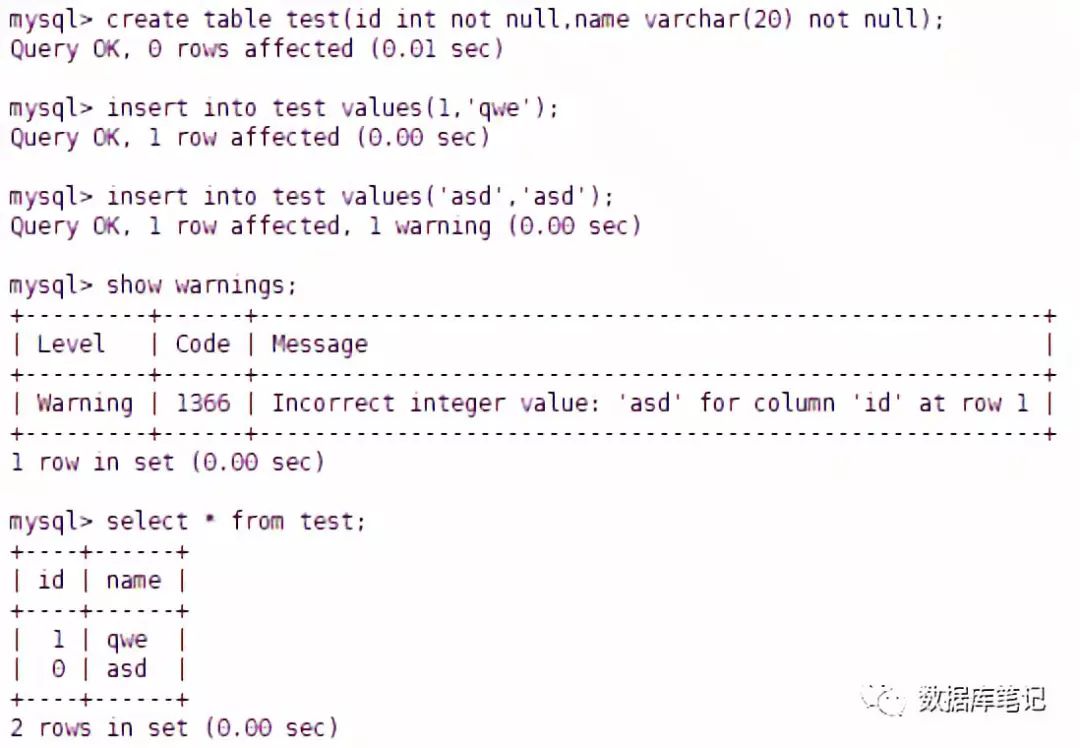 在5.5中,未设置STRICT_TRANS_TABLES限制的情况下,插入错误数据类型的数据仅会抛出警告,不会报错,将错误类型数据插入int字段会置为0,插入varchar会置为null。而在5.7中则会报错: