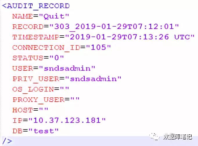 由参数解析中讲到的,审计日志可以支持多种形式,一般在datadir目录下的audit.log中,下面展示XML和JSON两种格式: