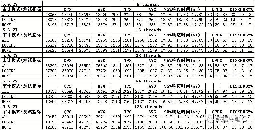 Percona MySQL 5.6.27: 压测表:30张 单表数据量:1百万 压测数据总大小:6.8G BUFFER POOL:4G 压测场景:审计ALL模式,审计LOGINS模式,无审计模式 压测并发数:8 threads,16 threads,32 threads,64 threads,128 threads 压测轮次:三轮 压测时长:5min Percona MySQL 5.7.18: 压测表:10张 单表数据量:1百万 压测数据总大小:2.4G BUFFER POOL:1G 压测场景:审计ALL模式,审计LOGINS模式,无审计模式 压测并发数:32 threads,64 threads,128 threads,256 threads 压测轮次:三轮 压测时长:5min