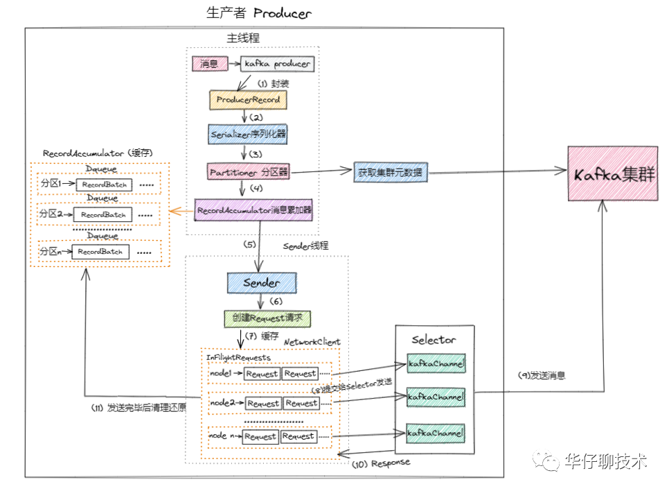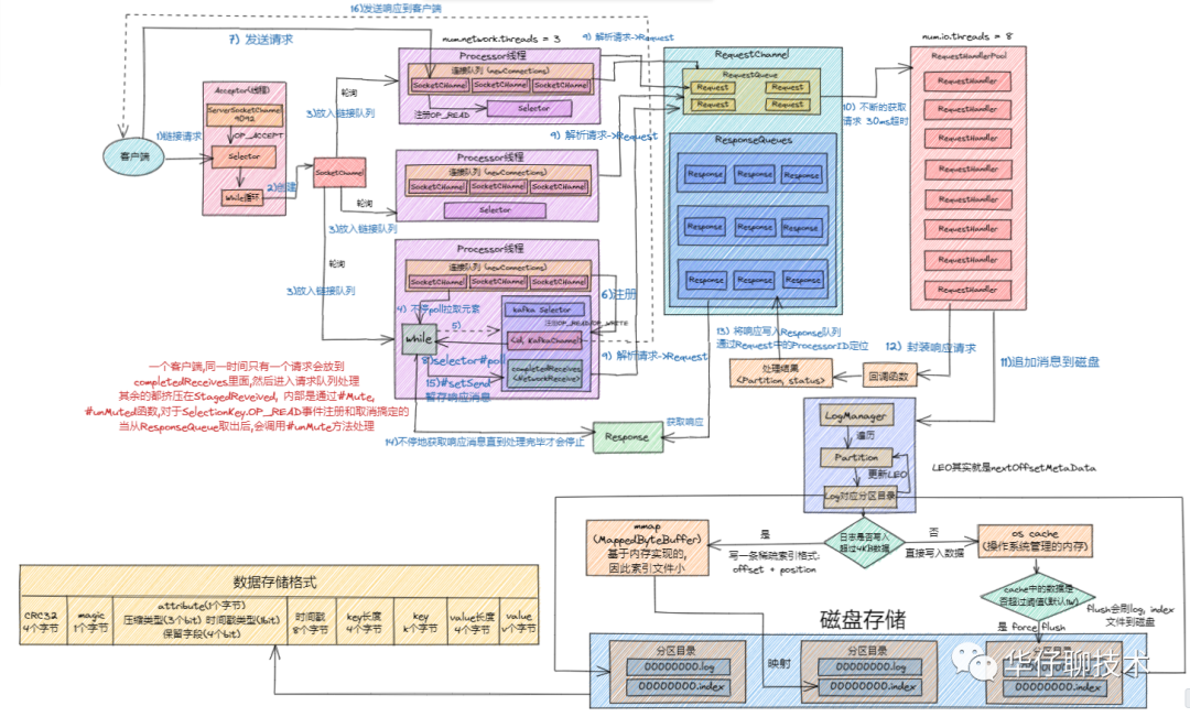 聊完发送消息流程和内存池设计模型后, 我们开始聊聊 Kafka Producer 最重要的部分, 高并发网络IO设计以及存储架构, 这里可以先查看 <Kafka 三高架构设计> 中的高并发网络设计部分, 然后再看这部分。上图是对之前的一个补充和完善, 将流程的经过做了顺序编号以及最后数据如何落地到磁盘以及存储格式的描述, 这是 kafka Producer 最最重要的部分, 也是 kafka Producer 可以抗高并发的重要设计精华所在, 简要流程如下: