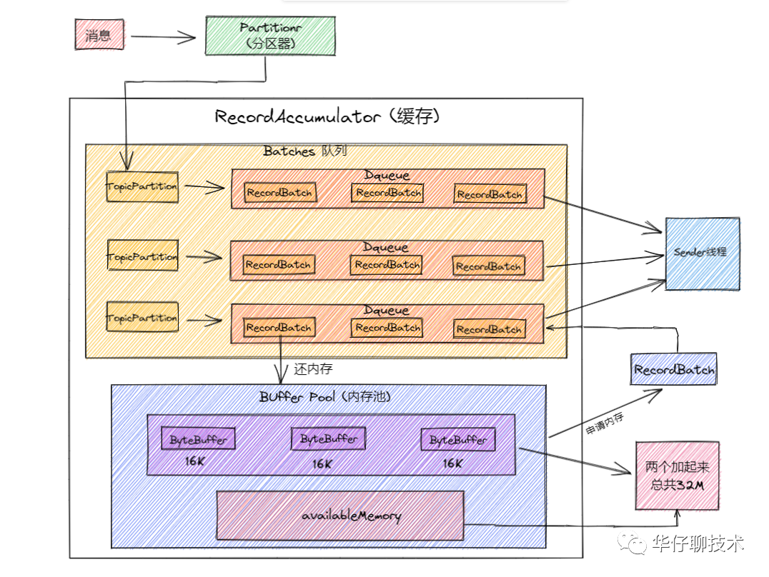从上图 Producer 发送流程的第6步中可以看到会把消息放入 accumulator中, 即调用 accumulator.append() 追加, 然后把消息封装成一个个Batch 进行发送, 然后去申请内存(free.allocate())