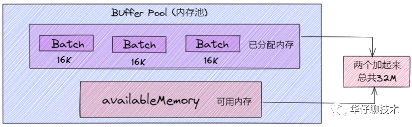 Kafka 内存设计有两部分,下面的粉色的是可用的内存(未分配的内存,初始的时候是 32M),上面紫色的是已经被分配了的内存,每个小 Batch 是 16K,然后这一个个的 Batch 就可以被反复利用,不需要每次都申请内存, 两部分加起来是 32M。