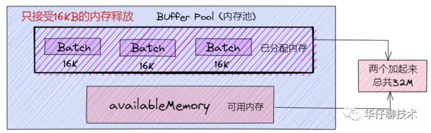 假设我们往已分配内存里释放了个 1M 的内存, 然后发送消息的时候是有条件限制的,要么是许多消息把 Batch 撑满了(16KB)发送出去,要么是一个 Batch 累积消息到一定的时间了,就会立马发出去。那么此时如果是一个 1M 的内存 Batch,才攒了几条消息,或者还不到1M, 等待时间到了,就把这个 1M 的内存批次发送出去了。这样内存的使用率是会非常低的。所以这里控制已分配内存必须是 16K 的,每个 Batch 的大小必须一致,这样才能充分利用内存空间。