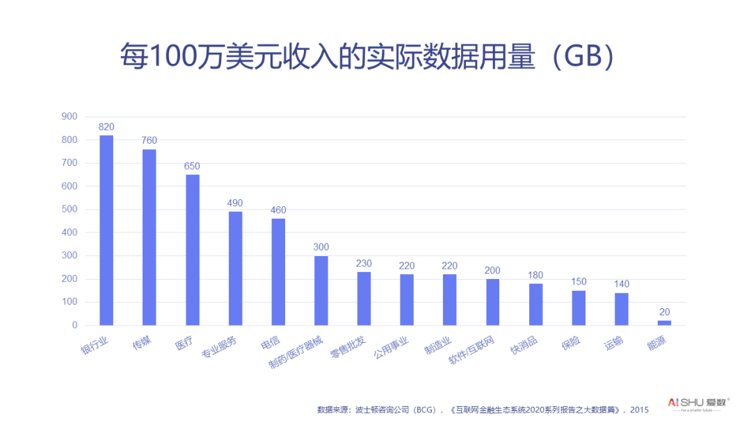 2015 年波士顿咨询公司(BCG)发布的《互联网金融生态系统2020系列报告之大数据篇》报告中提供的数据显示:银行业的数据强度高于其他行业,即每100万美元收入产生820GB的数据。