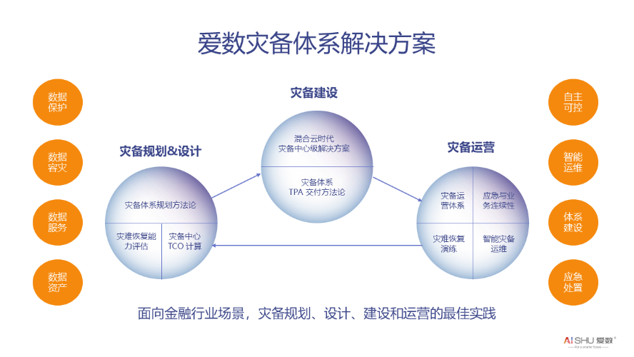 爱数灾备体系解决方案,包括灾备规划&设计、灾备建设以及灾备运营的全套端到端解决方案,最终实现针对金融行业业务特征的数据保护、数据容灾、数据服务、数据资产、自主可控、智能运维、体系建设、和应急处置等方面的落地。
